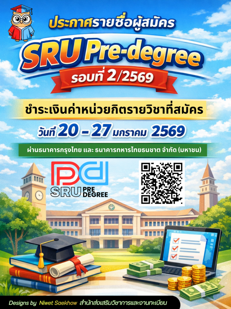 ประกาศรายชื่อผู้สมัคร SRU Pre-degree รอบที่ 2/2569 ชำระเงินค่าหน่วยกิตรายวิชาที่สมัคร วันที่ 20 – 27 มกราคม 2569 ผ่านธนาคารกรุงไทย และ ธนาคารทหารไทยธนชาต จำกัด (มหาชน) January 19, 2026 สำนักส่งเสริมวิชาการและงานทะเบียน ข่าวประชาสัมพันธ์ คลิกเพื่อตรวจสอบรายชื่อ SRU Pre-degree รอบที่ 2/2569 ประกาศมหาวิทยาลัยราชภัฏสุราษฎร์ธานี ค่าธรรมเนียมการศึกษาสำหรับผู้เรียน ระบบคลังหน่วยกิต พ.ศ. 2568 ระดับปริญญาตรีDownload