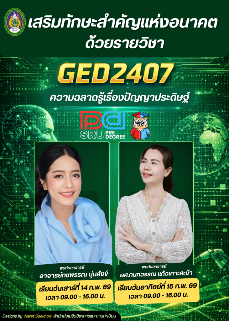 เสริมทักษะสำคัญแห่งอนาคต ด้วยรายวิชา GED2407 ความฉลาดรู้เรื่องปัญญาประดิษฐ์ SRU Pre-degree พบกับ อาจารย์กชพรรณ นุ่นสังข์ เรียนวันเสาร์ที่ 14 ก.พ. 69 เวลา 09.00 – 16.00 น. และ ผศ.กนกวรรณ แก้วเกาะสะบ้า เรียนวันอาทิตย์ที่ 15 ก.พ. 69 เวลา 09.00 – 16.00 น.