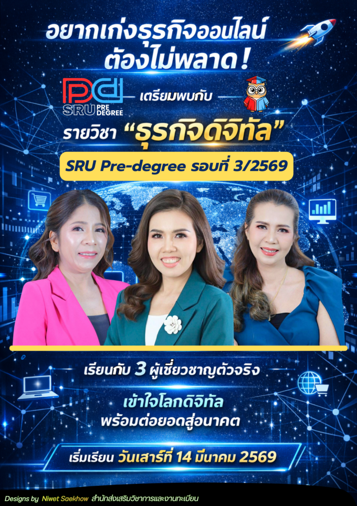 อยากเก่งธุรกิจออนไลน์ ต้องไม่พลาด! เตรียมพบกับ รายวิชา ธุรกิจดิจิทัล เร็ว ๆ นี้ SRU Pre-degree รอบที่ 3/2569 เรียนกับ 3 ผู้เชี่ยวชาญตัวจริง เข้าใจโลกดิจิทัล พร้อมต่อยอดสู่อนาคต เริ่มเรียน วันเสาร์ที่ 14 มีนาคม 2569 March 7, 2026 สำนักส่งเสริมวิชาการและงานทะเบียน ข่าวประชาสัมพันธ์