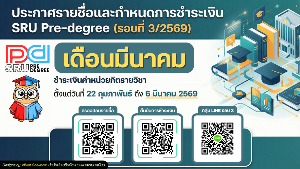 ประกาศรายชื่อและกำหนดการชำระเงิน SRU Pre-degree รอบที่ 3/2569 (เดือนมีนาคม) ชำระเงินค่าหน่วยกิตรายวิชา ตั้งแต่วันที่ 22 กุมภาพันธ์ ถึง 6 มีนาคม 2569 February 20, 2026 สำนักส่งเสริมวิชาการและงานทะเบียน ข่าวประชาสัมพันธ์ ระบบตรวจสอบรายชื่อผู้สมัคร SRU Pre-degree รอบที่ 3/2569 (เดือนมีนาคม)