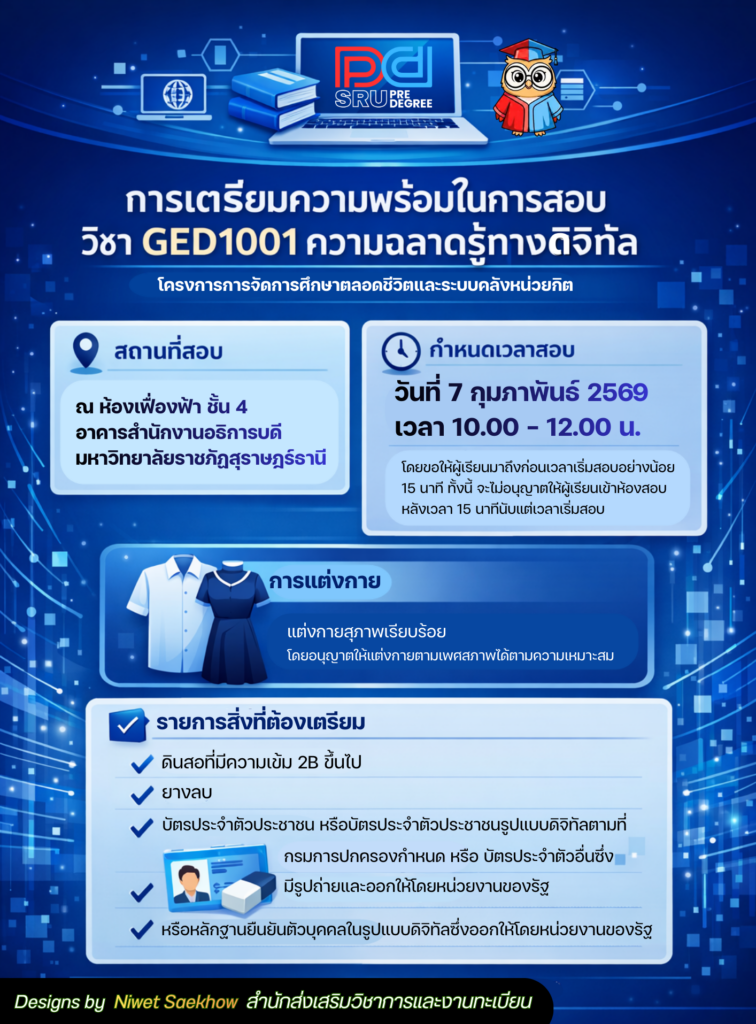 การเตรียมความพร้อมในการสอบวิชา GED1001 ความฉลาดรู้ทางดิจิทัล โครงการการจัดการศึกษาตลอดชีวิตและระบบคลังหน่วยกิต สอบวันเสาร์ที่ 7 กุมภาพันธ์ 2569 เวลา 10.00 – 12.00 น. ณ ห้องเฟื่องฟ้า ชั้น 4 อาคารสำนักงานอธิการบดี มหาวิทยาลัยราชภัฏสุราษฎร์ธานี January 30, 2026 สำนักส่งเสริมวิชาการและงานทะเบียน ข่าวประชาสัมพันธ์