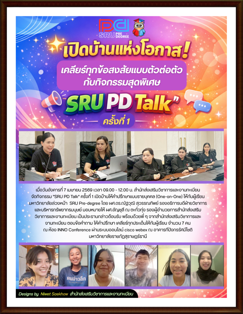 เปิดบ้านแห่งโอกาส! เคลียร์ทุกข้อสงสัยแบบตัวต่อตัว กับกิจกรรมสุดพิเศษ “SRU PD Talk” ครั้งที่ 1 ให้กับผู้เรียนมหาวิทยาลัยล่วงหน้า SRU Pre-degree April 7, 2026 สำนักส่งเสริมวิชาการและงานทะเบียน ข่าวประชาสัมพันธ์