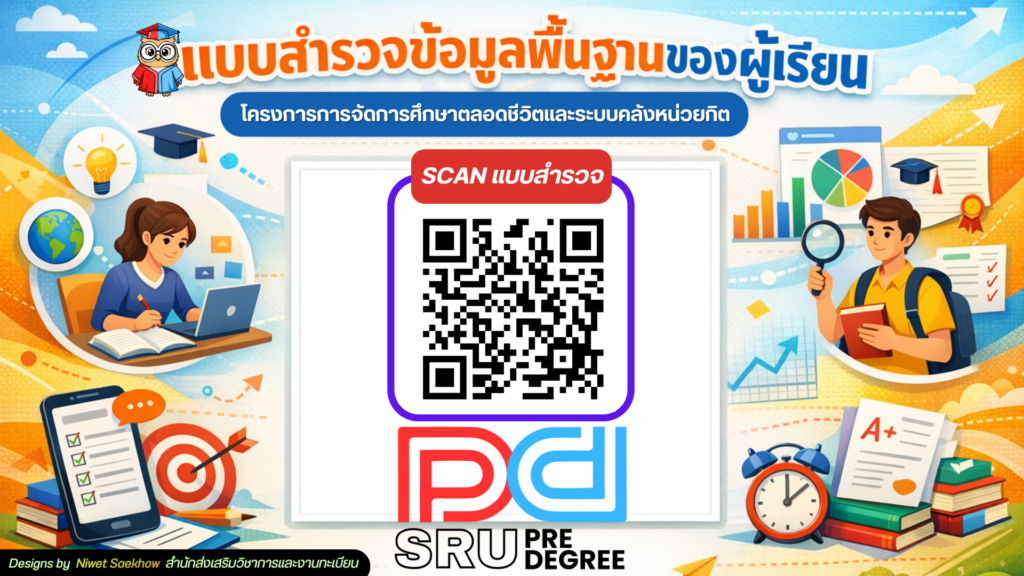 แบบสำรวจข้อมูลพื้นฐานของผู้เรียน โครงการการจัดการศึกษาตลอดชีวิตและระบบคลังหน่วยกิต SRU Pre-degree February 9, 2026 สำนักส่งเสริมวิชาการและงานทะเบียน ข่าวประชาสัมพันธ์ แบบสำรวจข้อมูลพื้นฐานของผู้เรียน โครงการการจัดการศึกษาตลอดชีวิตและระบบคลังหน่วยกิต SRU Pre-degree